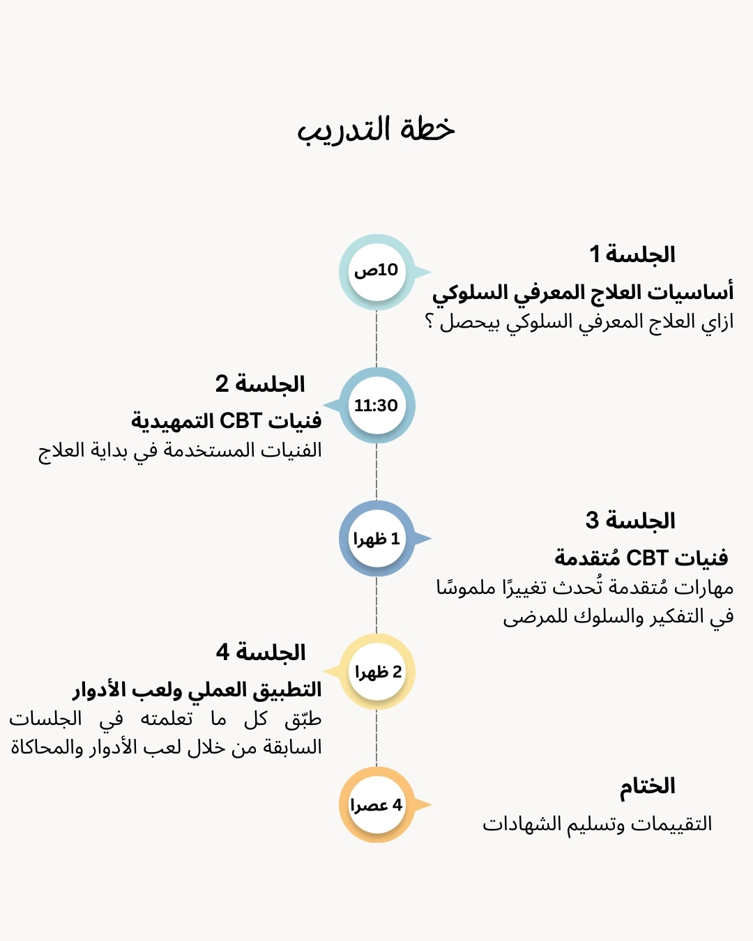 انضم إلينا في ورشة عمل مُتخصصة في العلاج المعرفي السلوكي (Cognitive Behavioral Therapy - CBT) , المُقدّمة من المعالج النفسي المعتمد أحمد أشرف. تعرّف على أساسيات وتطبيقات العلاج السلوكي المعرفي لتحقيق تغيير حقيقي في حياتك المهنية والشخصية. هذه الورشة فرصة ذهبية لطلاب علم النفس والمهتمين بالمجال لاكتساب مهارات عملية من خلال جلسات مكثفة وتطبيق مباشر.